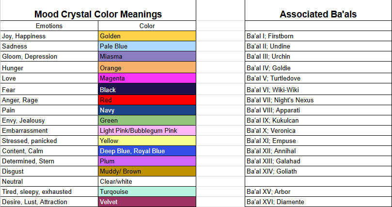 Heiri carries with her a crystal that changes color based on the emotion that is most prevelant at the time, and shines brighter the closer she gets to the source of said emotion. If you wish to have your emotions displayed; or to take place in an rp involving a Ba'al, simply send a tell or a whisper!